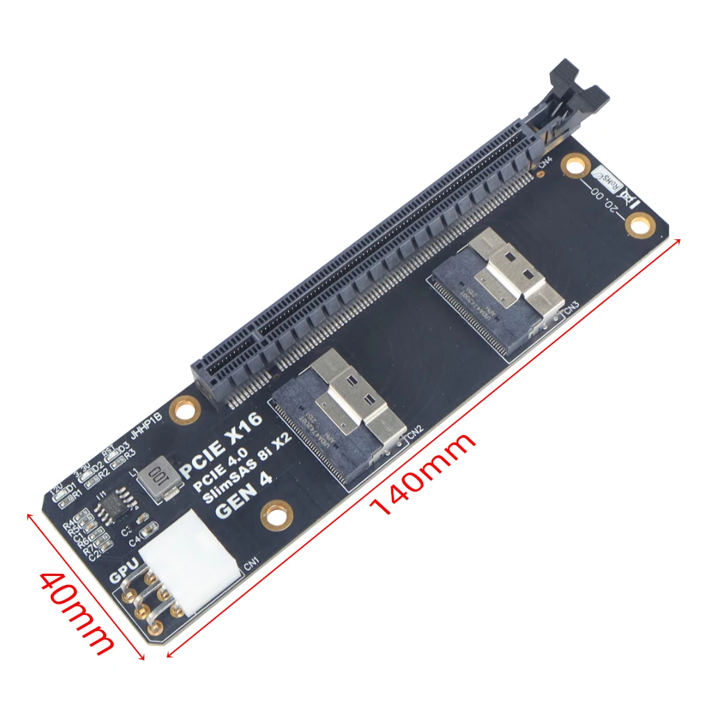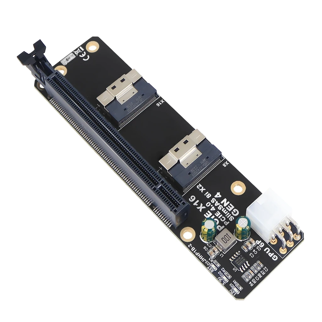 2つのSlimSAS 8iコネクタを、PCIe 4.0x16スロットに変換し、フル帯域幅の高速接続を可能にする画期的なライザーカードです。
