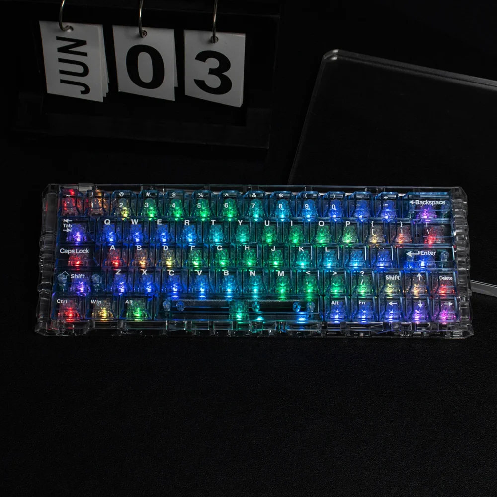 本体が透明なPC素材のため、キーボードのRGBバックライトの光を$100%$透過。カスタムキーボードの魅力を最大限に引き出します。
