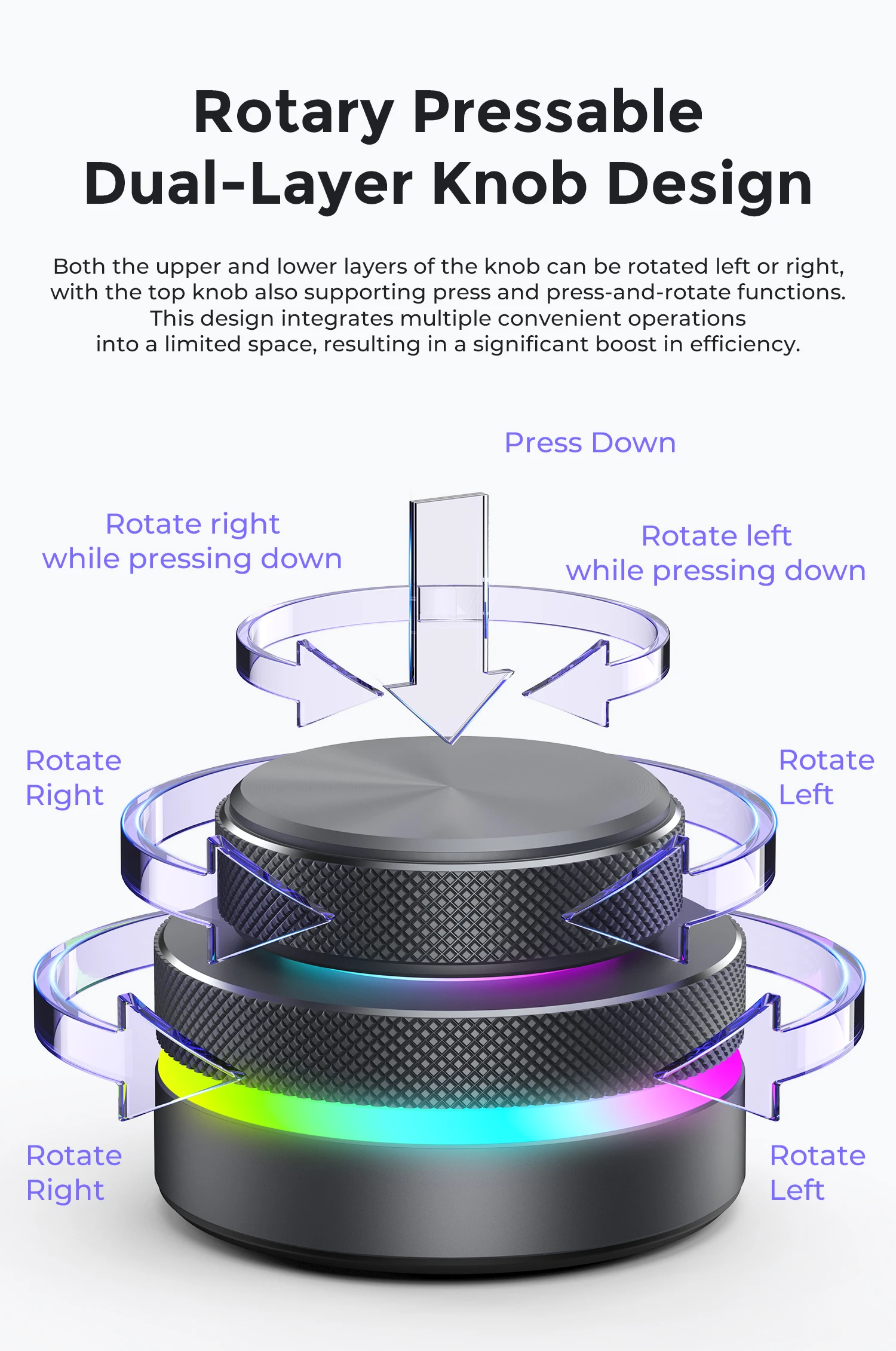 デュアルレイヤーノブデザイン: 上下二層のノブで構成され、回転およびプッシュボタン機能に対応しています。