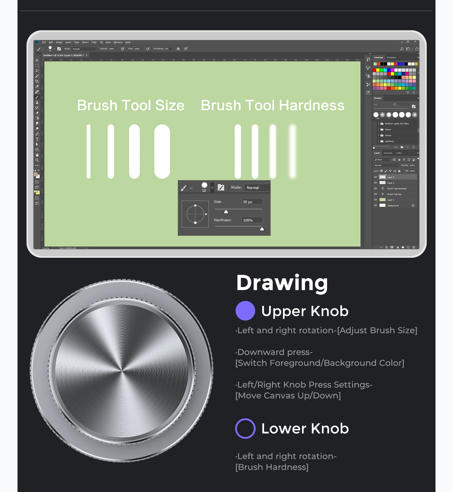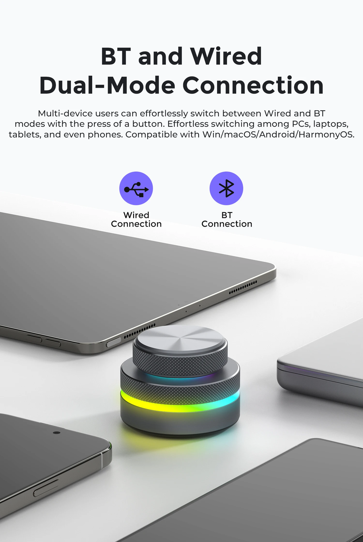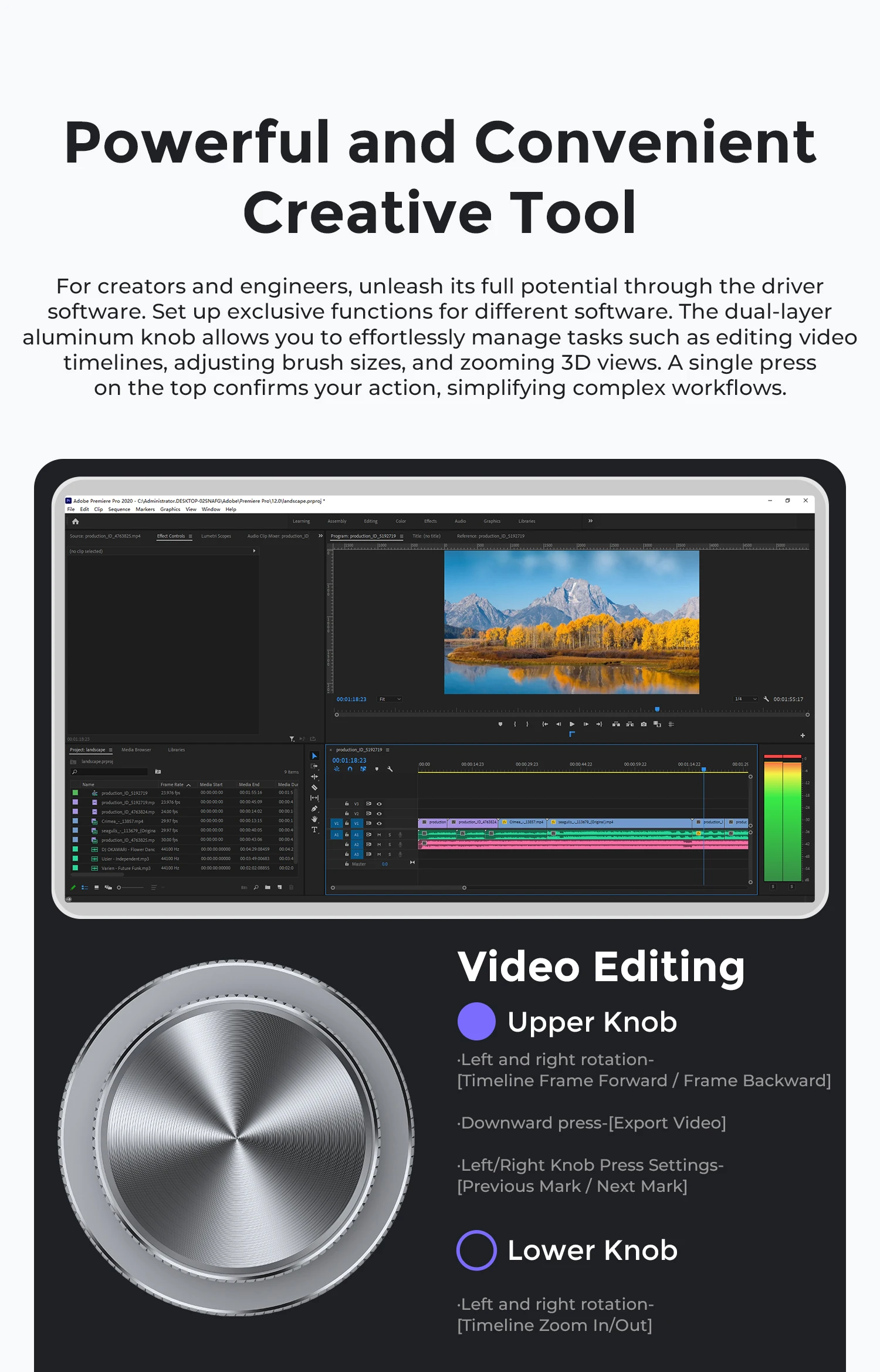 グラフィックデザイン、動画・音声編集、3Dモデリングなど、あらゆるクリエイティブ作業の効率を劇的に向上させる、アルミ合金製のデュアルレイヤーノブ・カスタムキーパッドです。限られたスペースに便利なコントロールを集約し、作業効率を倍増させます。
