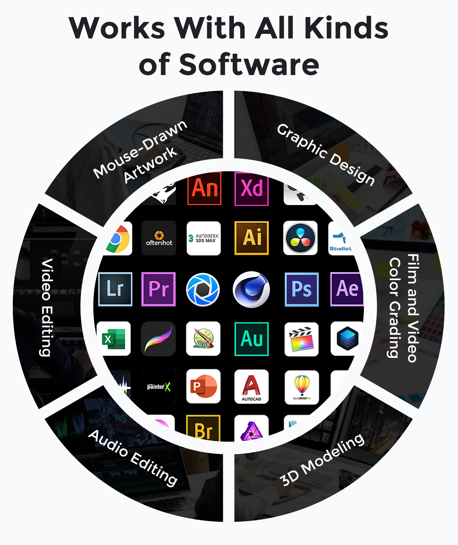 グラフィックデザイン (Ps, Ai)、動画編集 (Pr, Ae, Lr)、音声編集 (Au)、3Dモデリング、Procreate設定など、あらゆる種類のソフトウェアに対応しています。