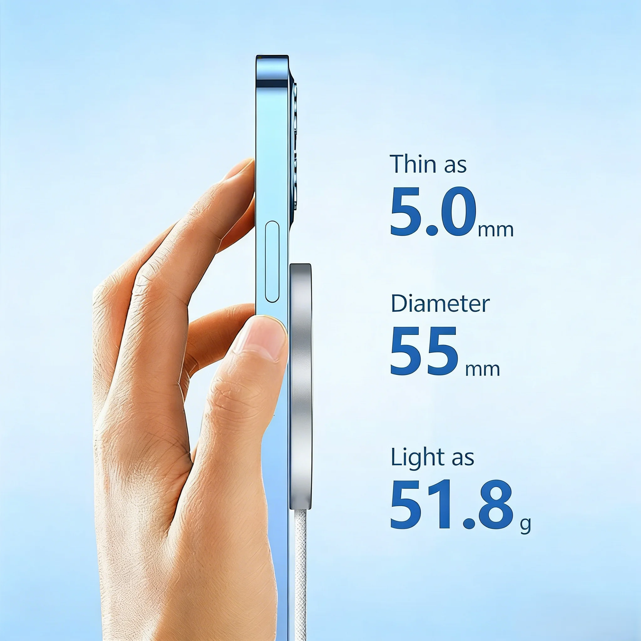 厚さはわずか5.0mm、重量は51.8gと、充電しながらの操作を邪魔しない超薄型・軽量設計です。