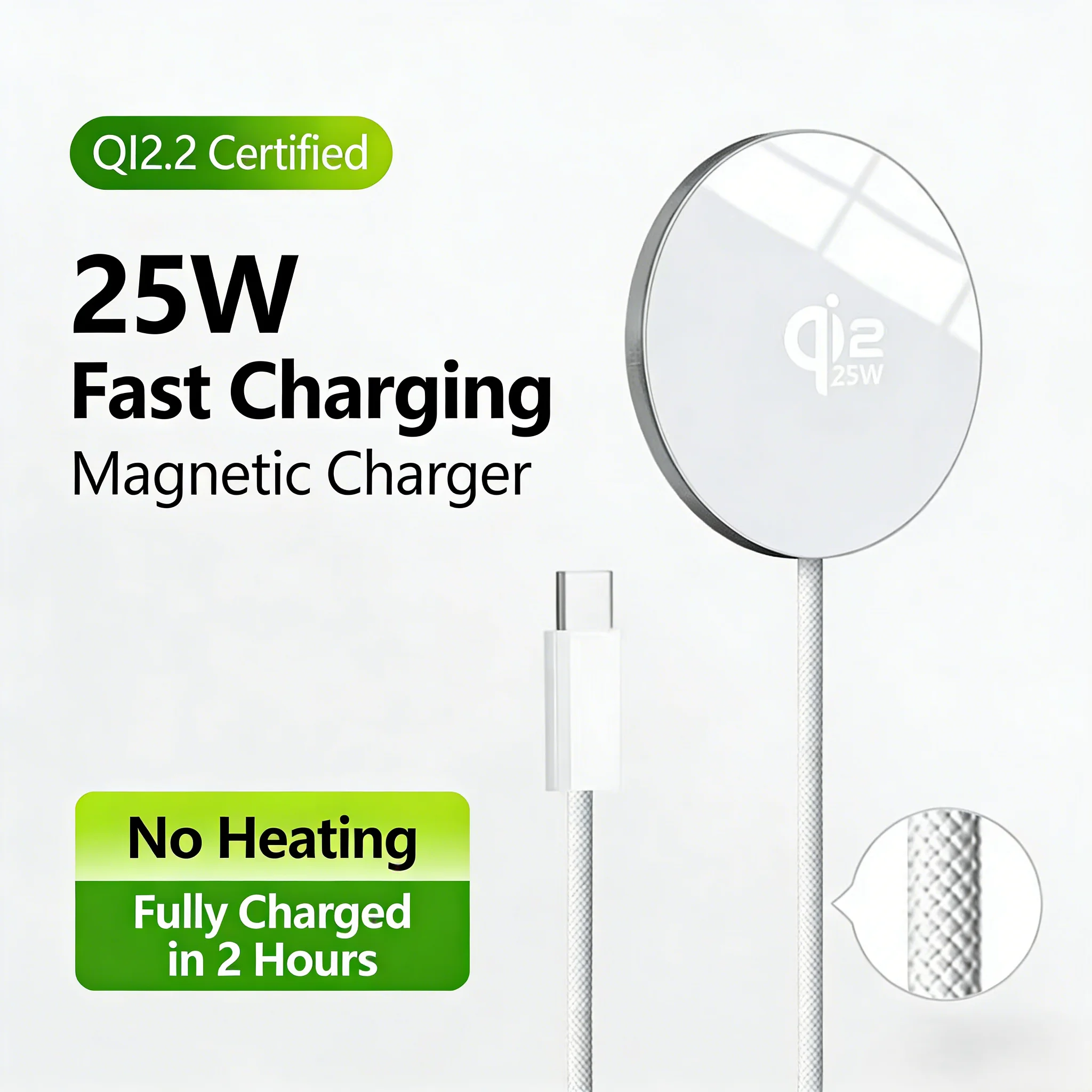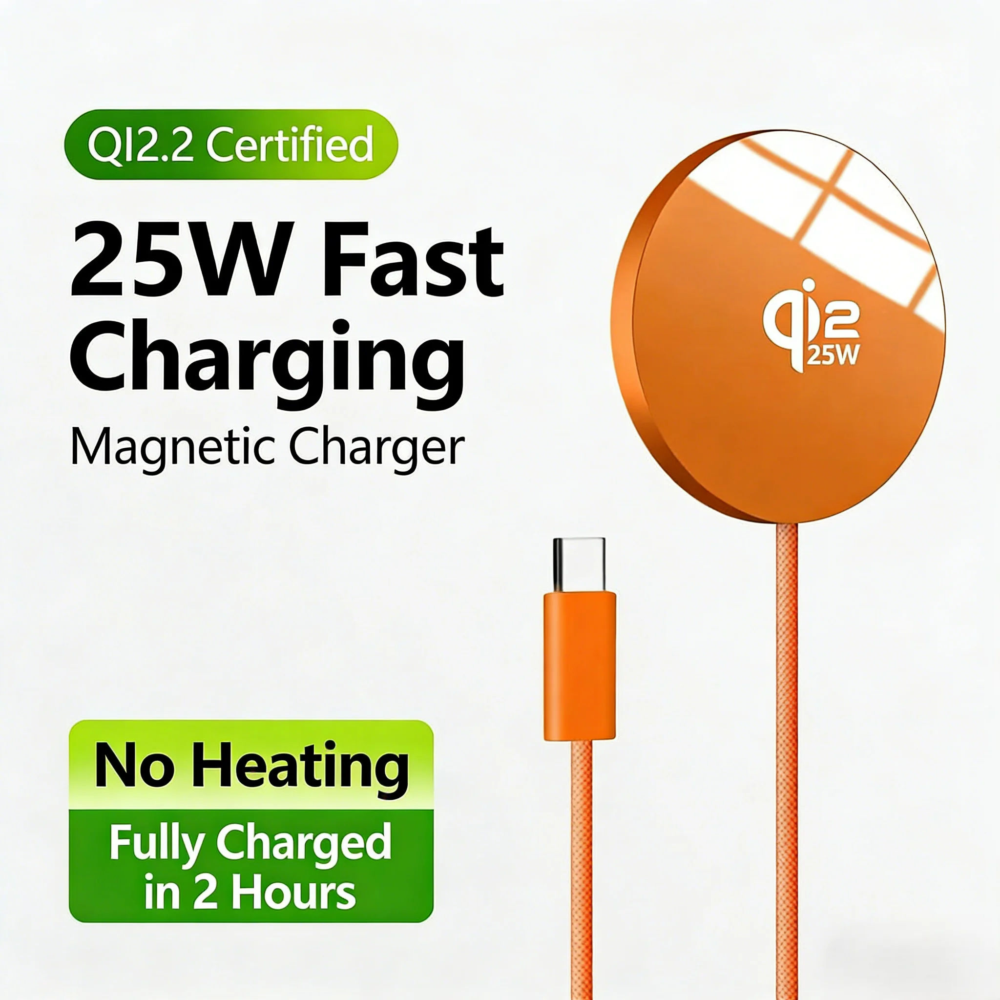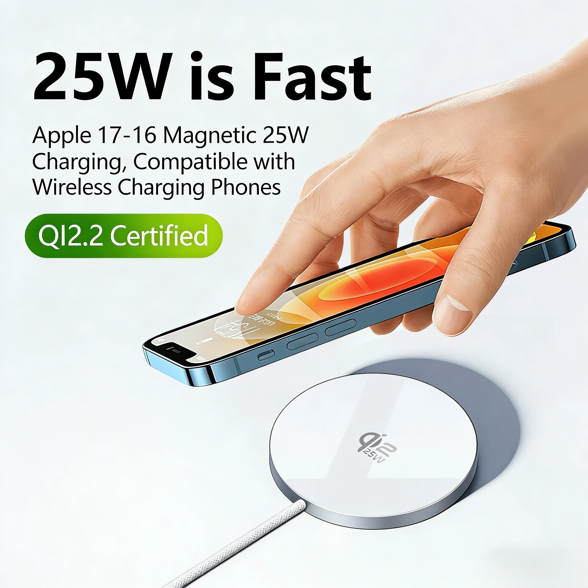 最新のQi2.2認証を取得した、MagSafe対応のマグネット式ワイヤレス充電器です。最大25Wの超高速ワイヤレス充電を実現し、スマートフォンを効率的かつ安全に充電します。