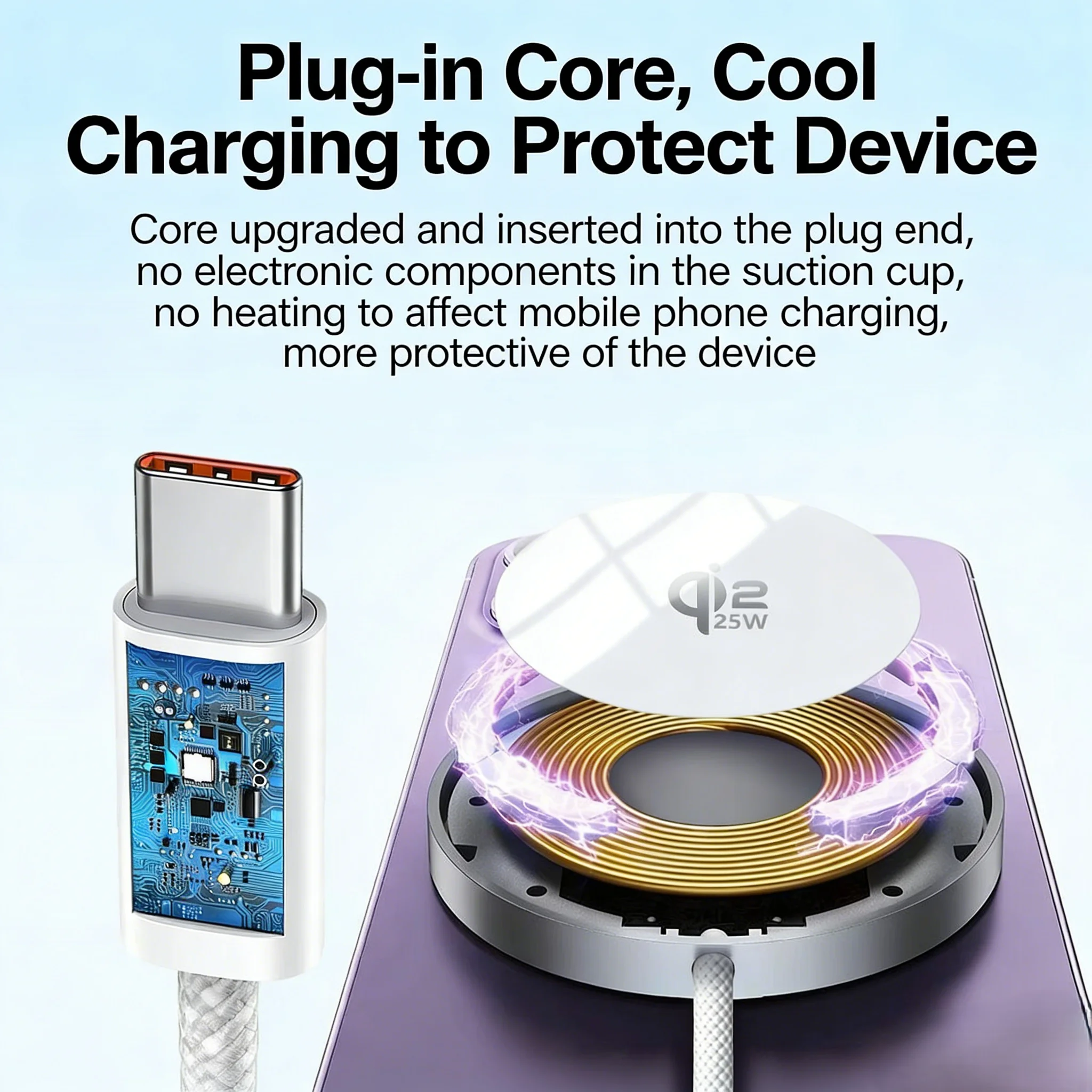 電子部品を吸着部(吸盤側)ではなく、プラグ側に配置。吸着部が熱を持たないため、スマートフォンのバッテリーへの影響を最小限に抑え、デバイスを保護しながら安定した充電が可能です。