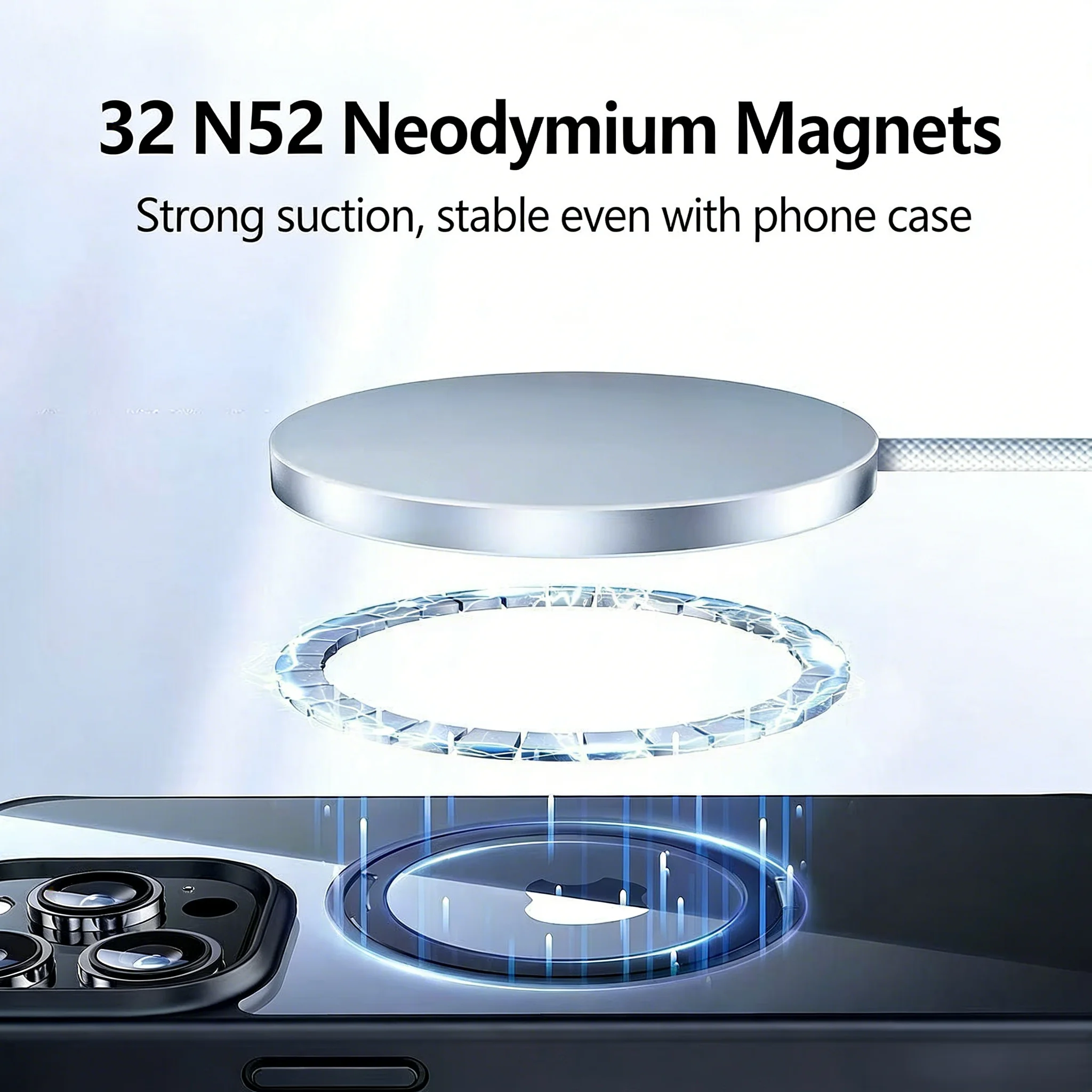 32個のN52ネオジム磁石を内蔵。強力な吸引力により、スマートフォンケースを装着したままでも安定した固定が可能です。