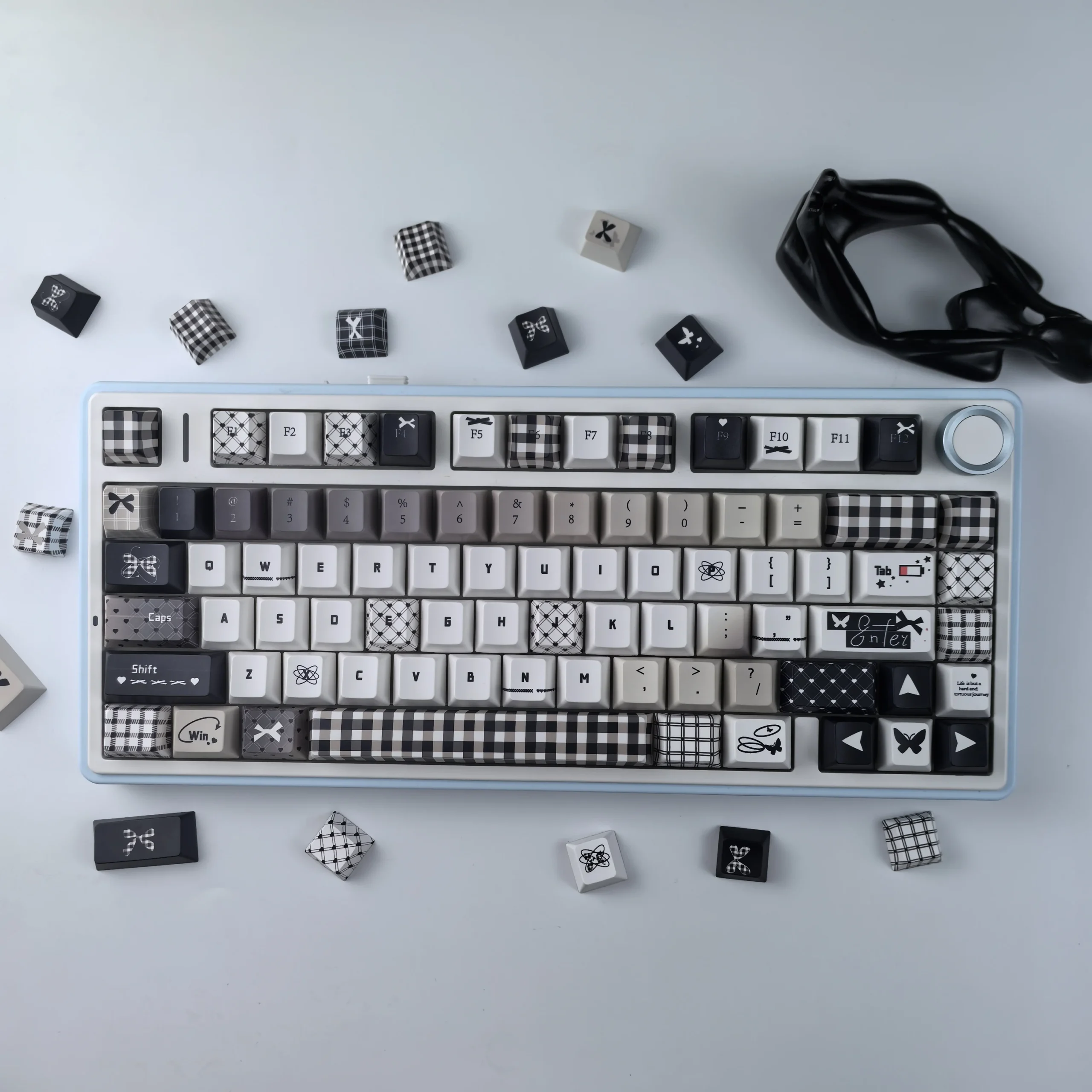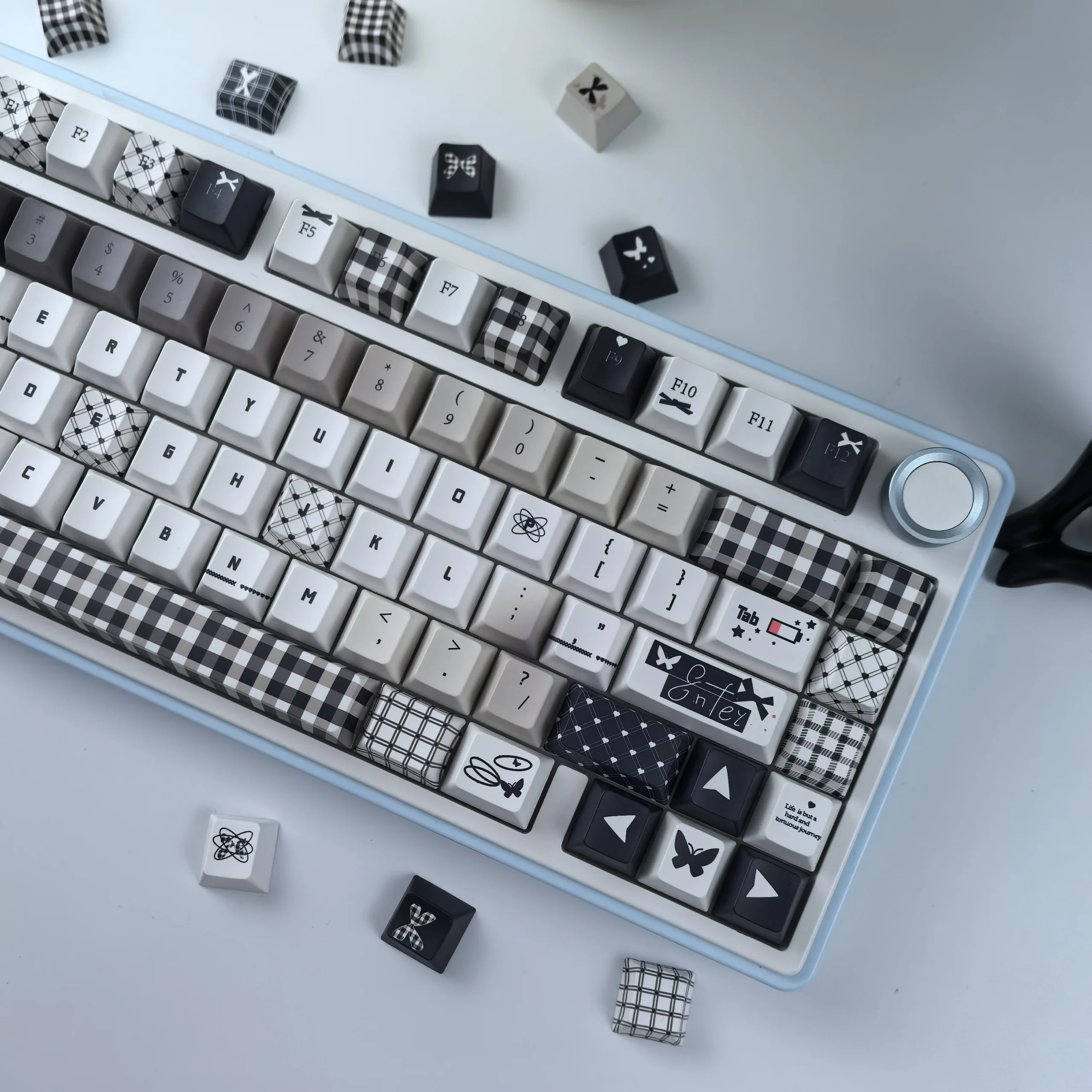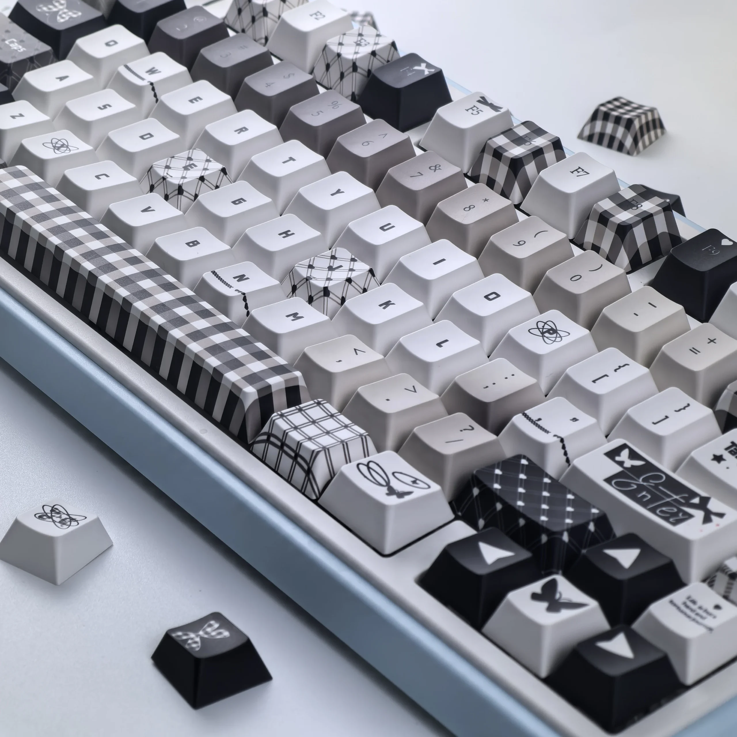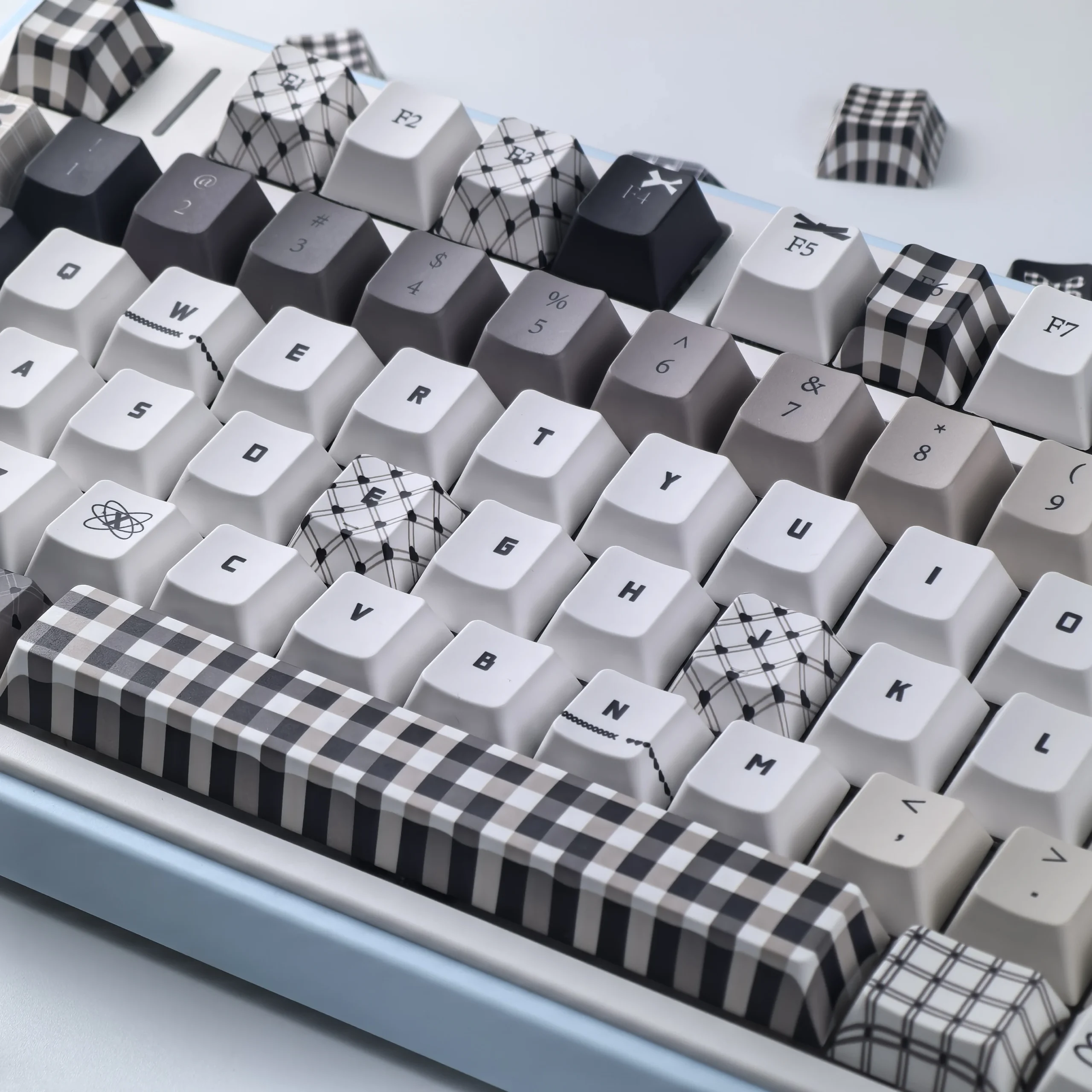 このキーキャップセットは、白黒チェック柄(Plaid)が特徴のレトロブリティッシュスタイルのデザインです。