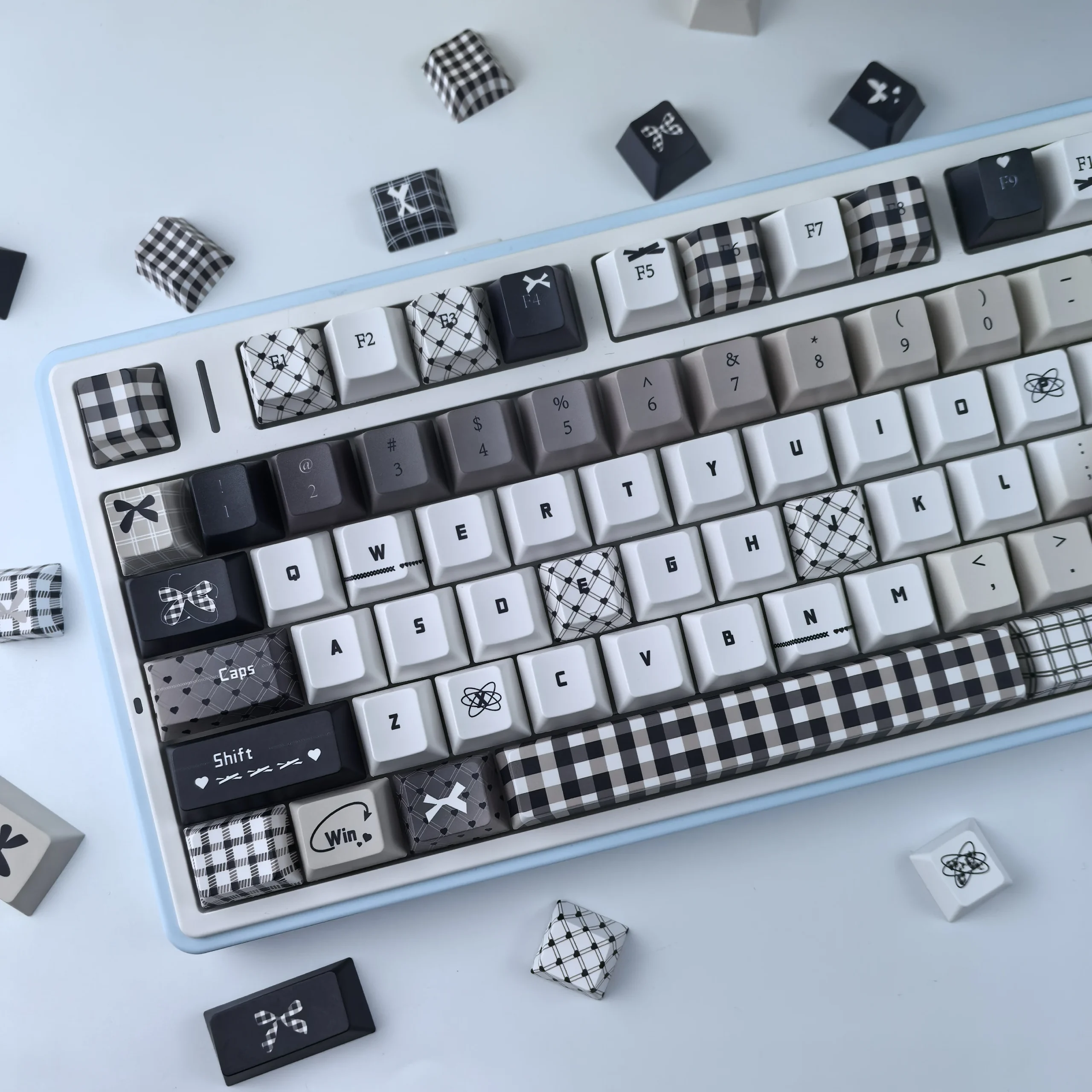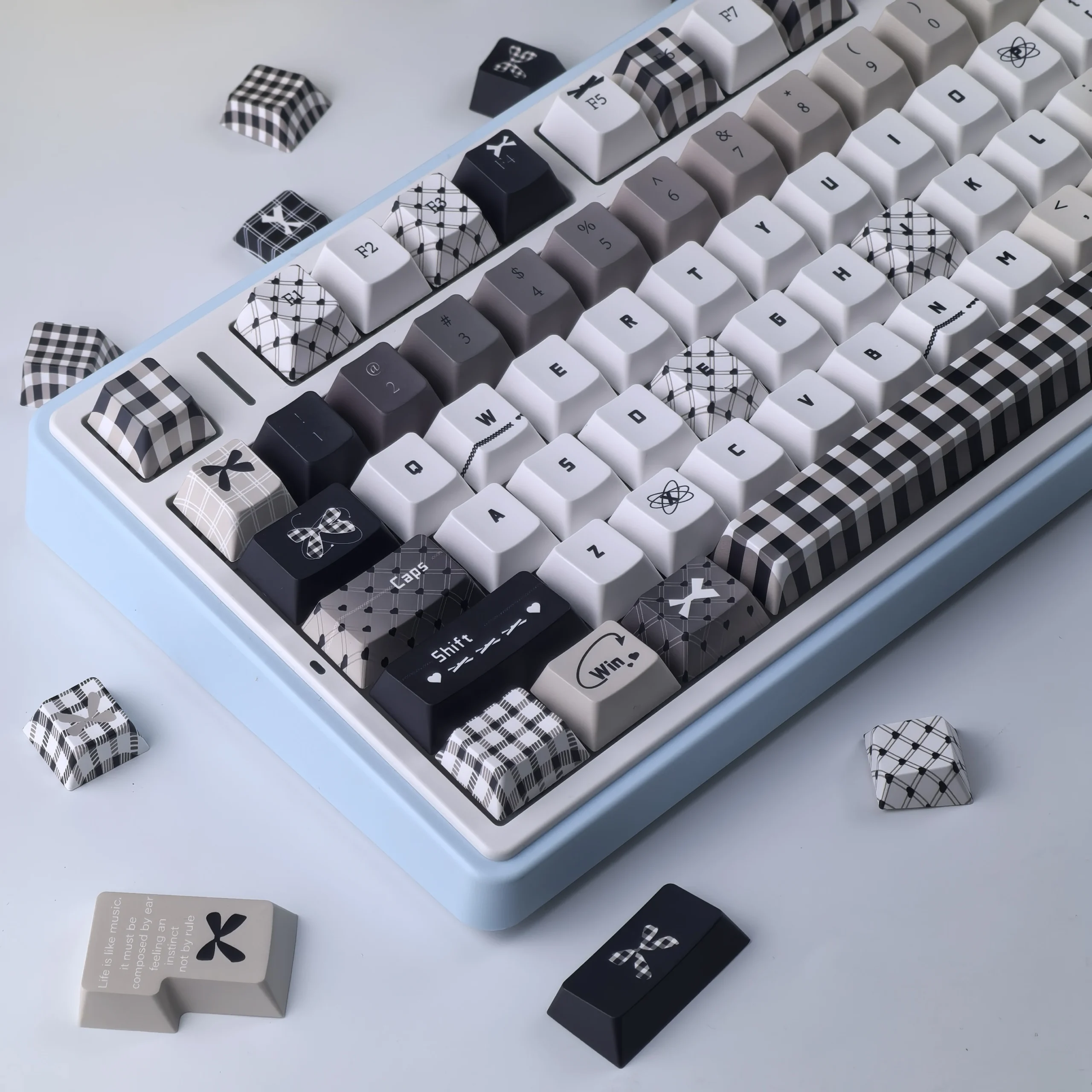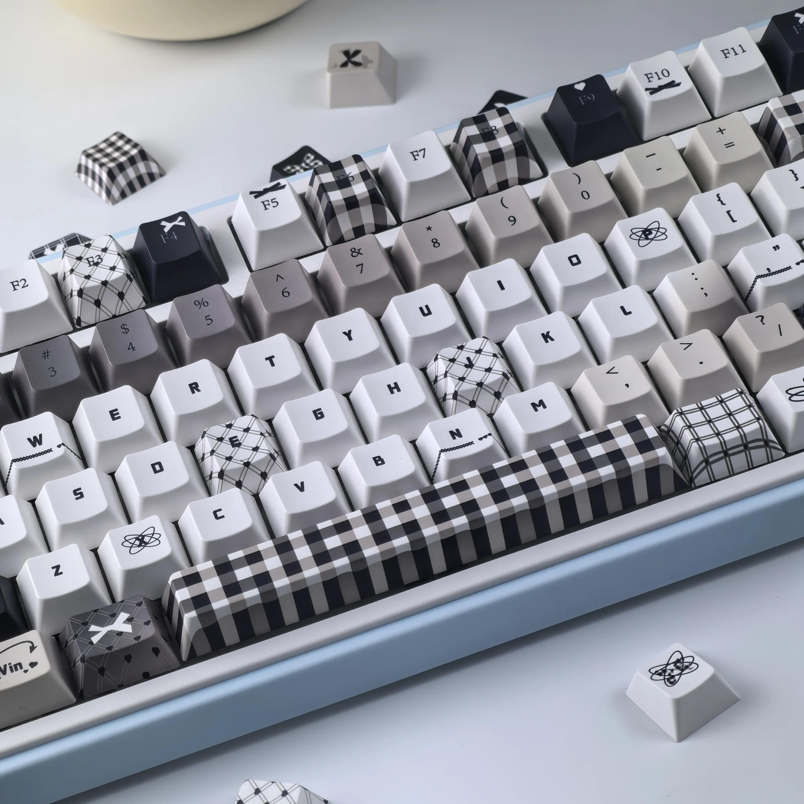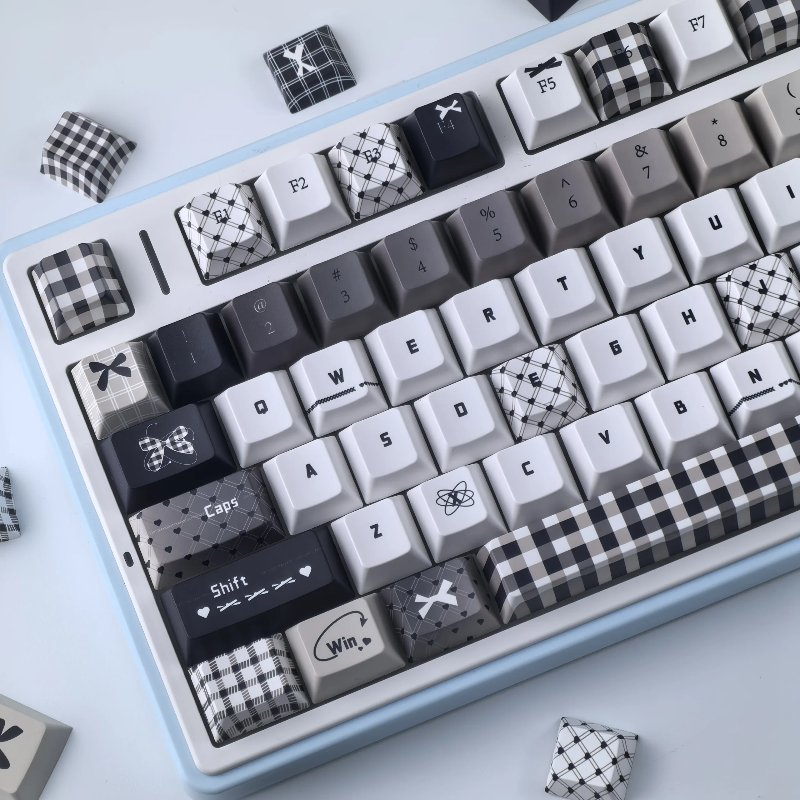 このキーキャップセットは、白黒チェック柄(Plaid)が特徴のレトロブリティッシュスタイルのデザインです。
