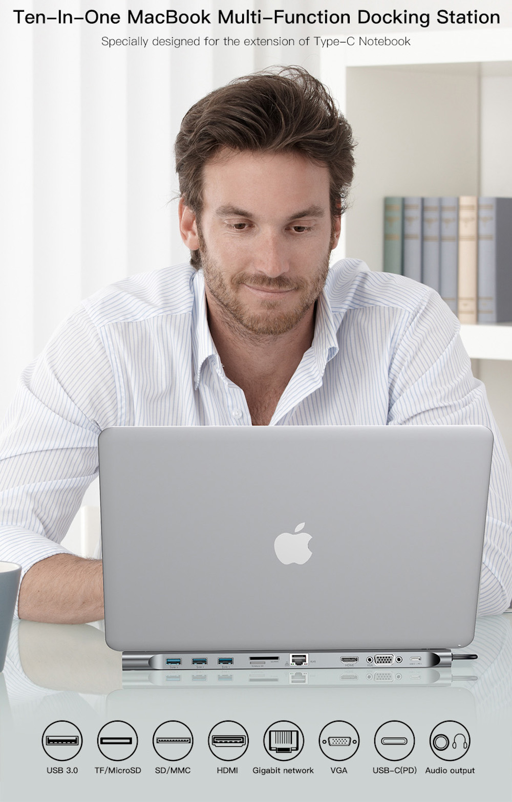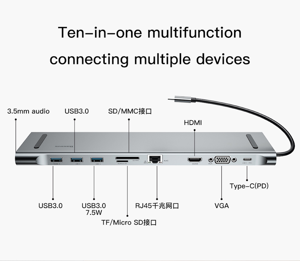10in1 USB Type-C to HDMI VGA USB 3.0 RJ45イーサーネット SD/microSDカード オーディオ出力 ベースステーション